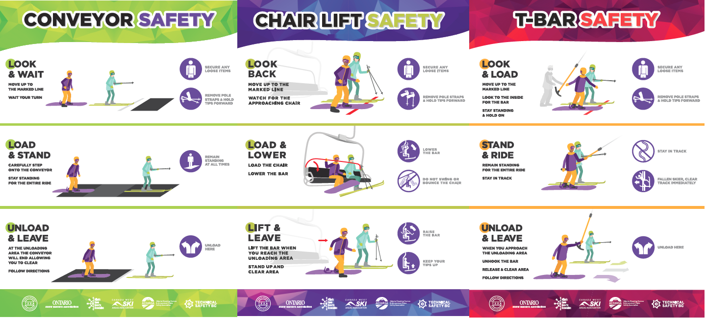 滑雪场周围有许多缆车安全提示标识,它们非常重要。请务必注意并遵守这些指示。如果你对缆车操作不熟悉,请随时向工作人员询问。滑雪、单板及自行车课程也是学习缆车使用的好方式。